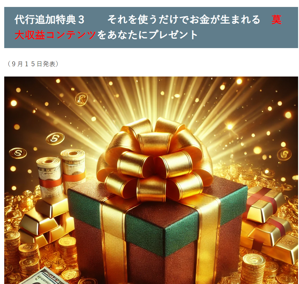かつ、追加特典3は単体で収益を獲得できるコンテンツになってます。