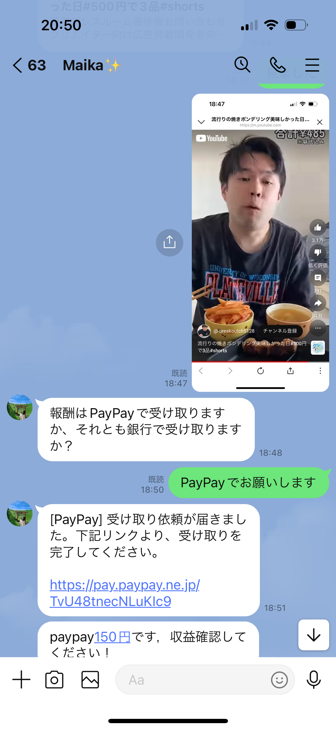 Youtubeを見たら報酬といった感じで合計350円実際にペイペイに振り込まれました。