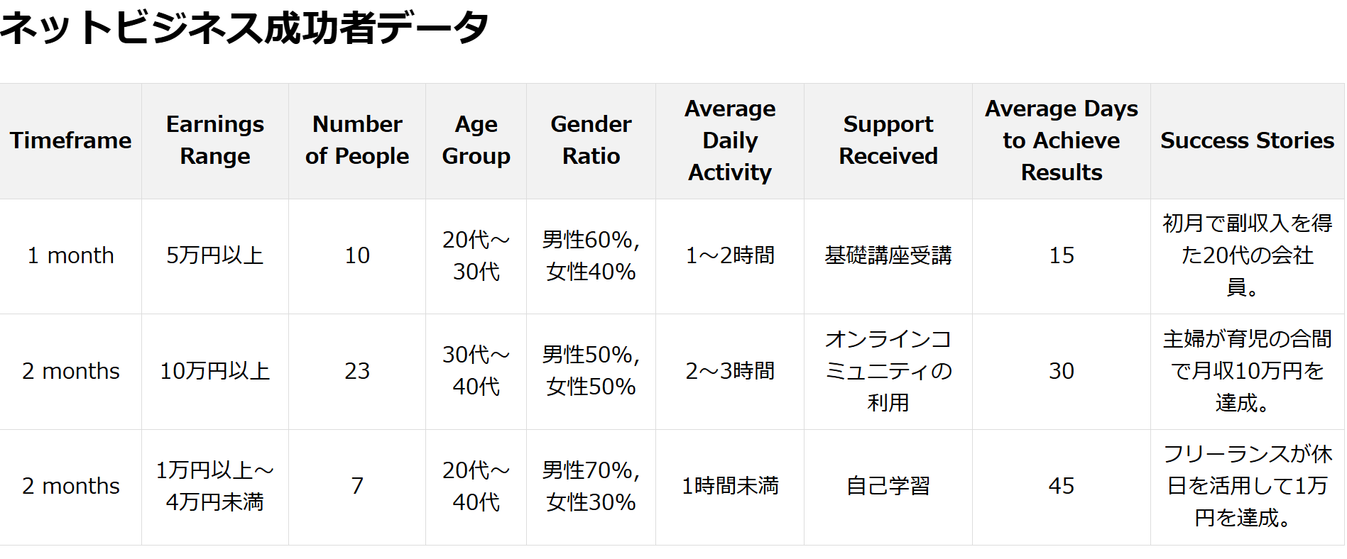 ※「Success Stories」⇒一か月5万円以上、二か月10万円以上、二か月1~4万円未満の収益を得た方の中で最も早く成果を上げた方の職業など