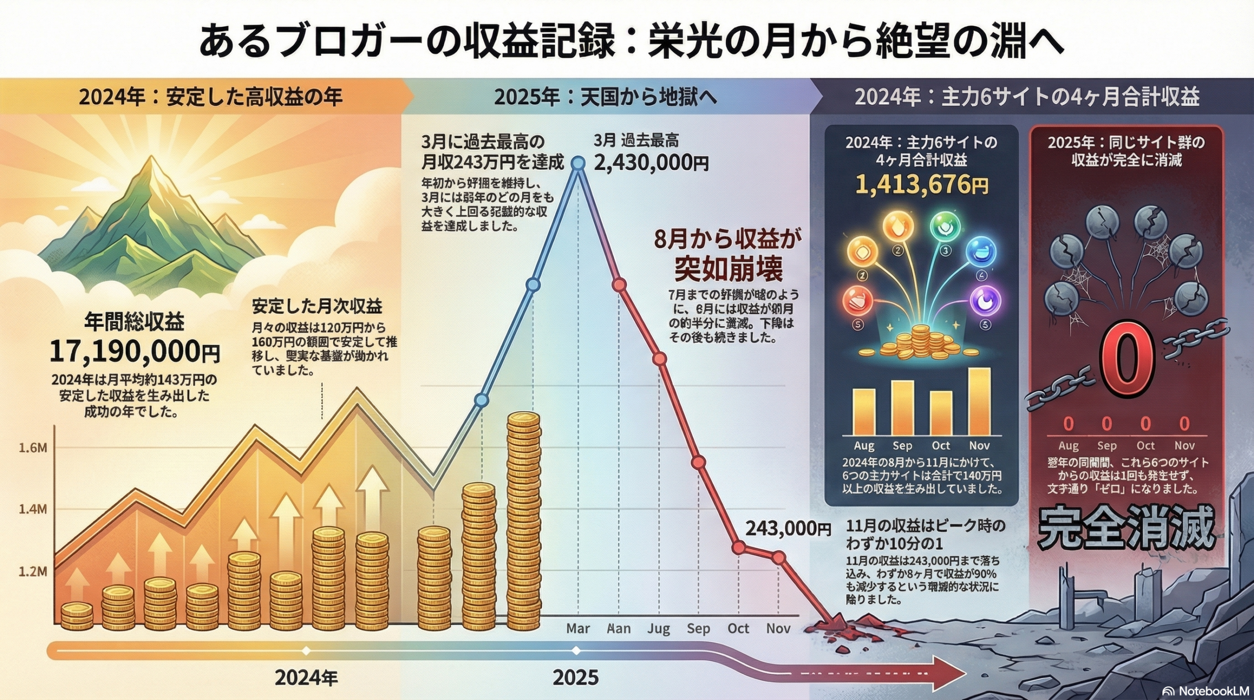 稼げていた時期と稼げなくなった時期を表で表してます。